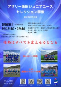ほたるパークでセレクションを実施しました! 選手たちの一生懸命なプレーに感心と感動です! 下伊那地区の指導者のみなさんの指導力の賜物です。 みんな、是非ともアザリーでプレーして欲しいですね。 10/24もセレクションです。 多くの選手の参加を楽しみに待ってます!