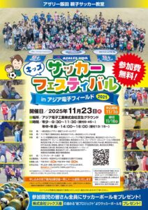 🏆アザリー飯田 キッズフェスティバル開催のお知らせ🎉 アザリー飯田では、1年に1回の特別イベント「キッズフェスティバル」を開催します!サッカーを通じて楽しく体を動かしながら、トップチームの選手と一緒に笑顔いっぱいの1日を過ごしましょう⚽✨ 📅 開催日時 2025年11月23日(日) 📍 開催場所 アジア電子芝グラウンド 🕓 申込締切 2025年11月16日(日)まで 🗓 スケジュール 年少さん:午前の部(9:30〜予定) 年中・年長さん:午後の部(14:00〜予定) それぞれ 定員40名 までとなります。定員に達し次第締め切りとなりますので、お早めにお申し込みください! ※年少さん、年長さんは定員に達しました 💡 参加費 無料です! 📝 参加申込み 以下のGoogleフォームよりお申し込みください。 お申し込みフォームはこちら ❓お問い合わせ ご質問などがある場合は、ホームページのお問い合わせフォームからお気軽にご連絡ください。 みんなでアザリー飯田の「年に一度のお祭りイベント」を楽しみましょう!たくさんのご参加をお待ちしています🎈