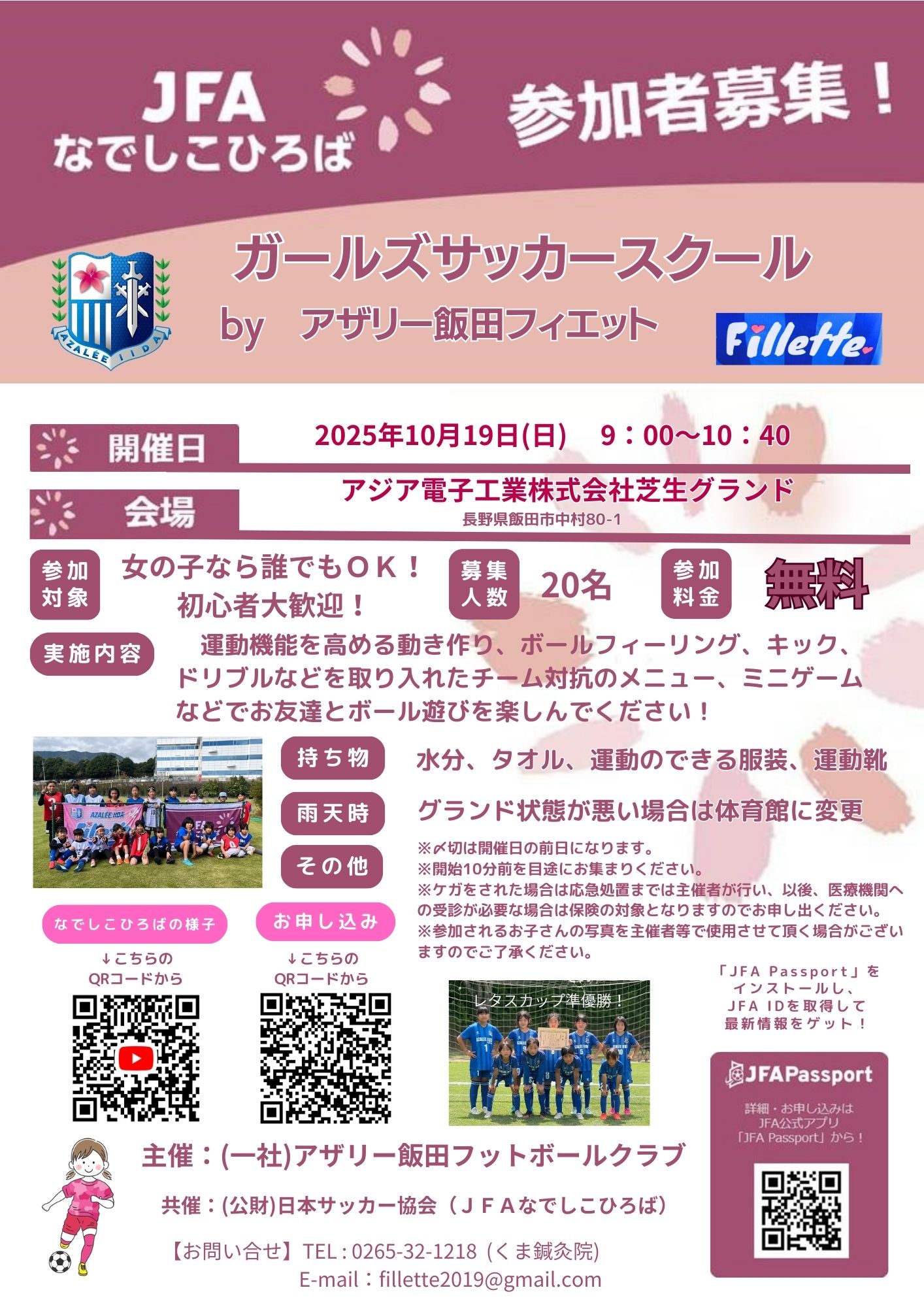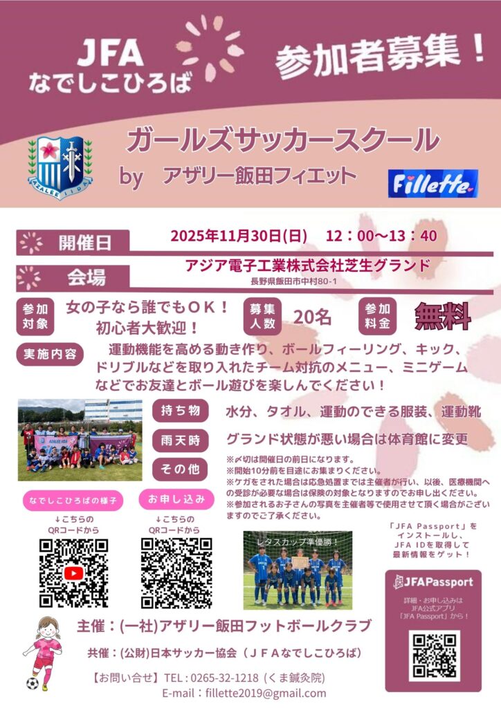 アザリー飯田は、不定期ですがガールズサッカースクール「JFAなでしこひろば」を開催しております。